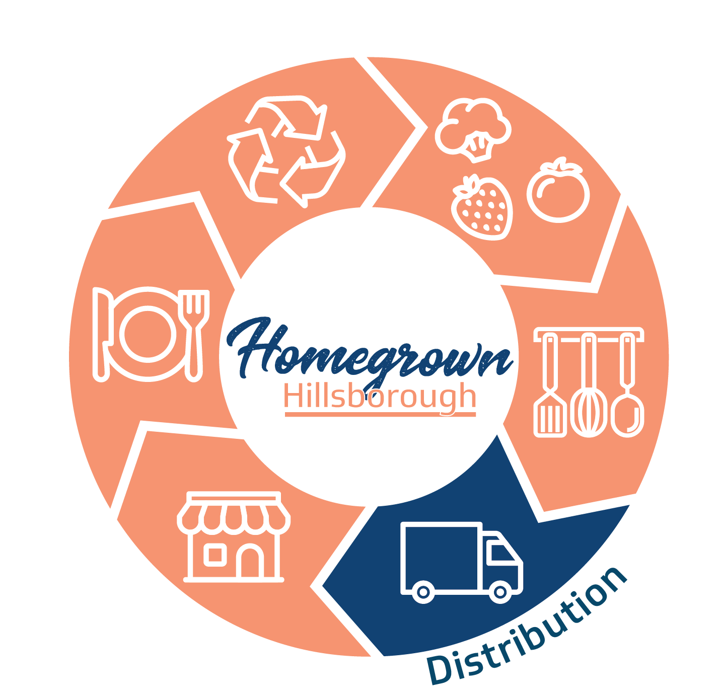 A food system includes all the processes and infrastructure involved in feeding a population, as depicted in the sectors below. The Food System Wheel is Homegrown Hillsborough’s depiction of the interconnected aspects that influence nutrition, food, health, community development, and agriculture.